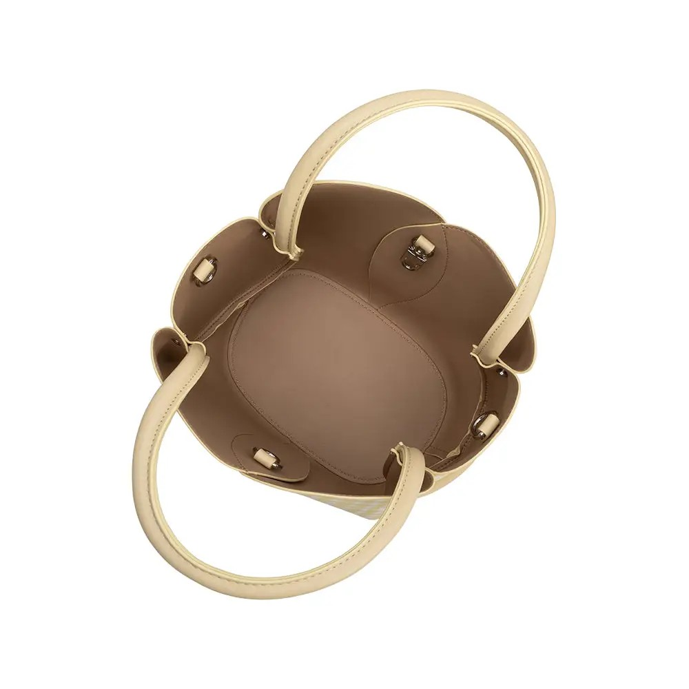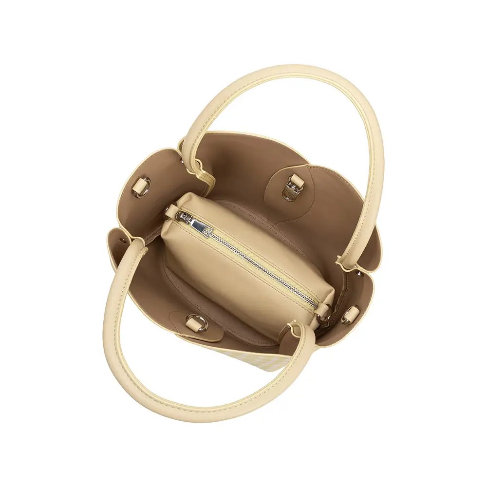 The Gingham Tulip Handbag features a pastel yellow gingham print and a unique tulip shape, crafted from recycled vegan leather. Its design includes a top handle and a detachable crossbody strap for versatile carrying options. The included zip pouch offers organized storage, enhancing functionality without compromising style.