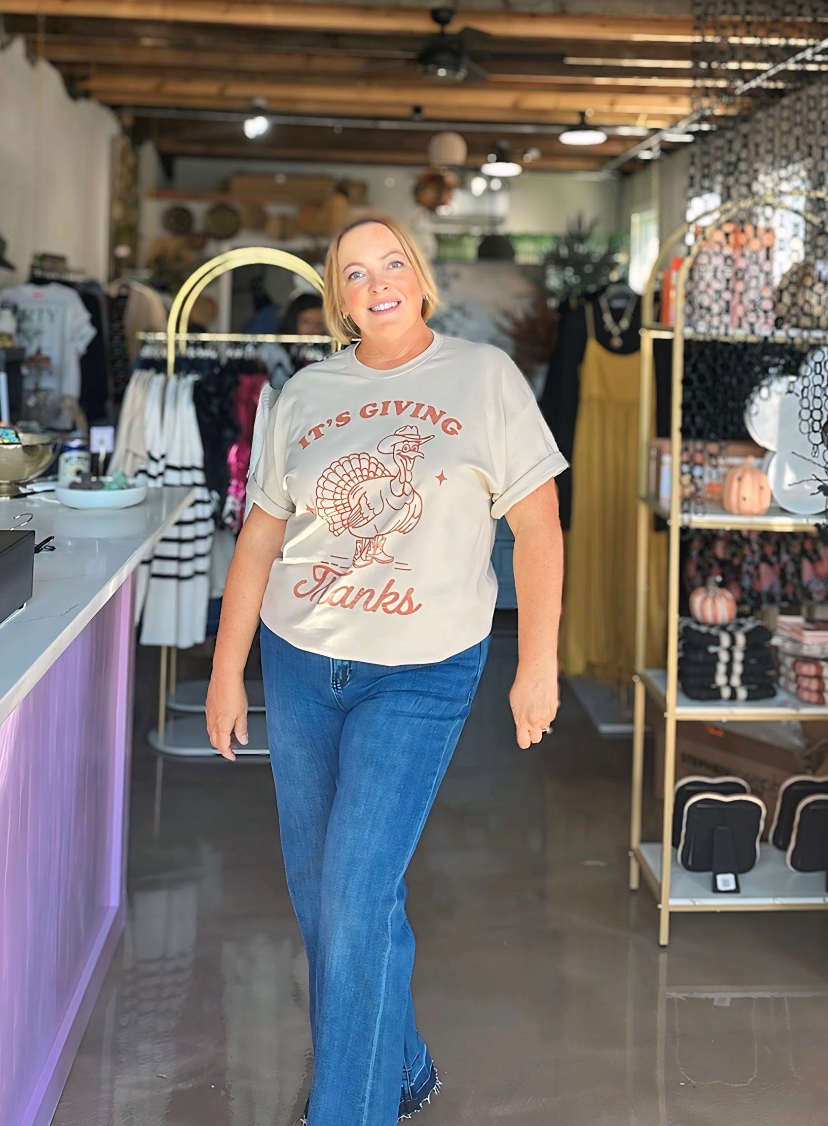Stay comfortable and stylish with the It's Giving Thanks Tee. Made with premium cotton, this oversized unisex tee features a turkey graphic for a festive touch. Its oversized fit ensures both comfort and style. Perfect for any occasion, this tee is a must-have for your wardrobe.