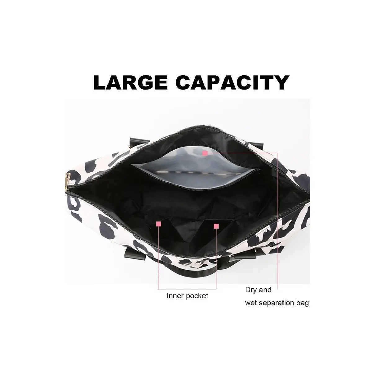 This Leopard Print Weekender is a versatile and stylish duffle bag perfect for all your weekend getaways. With a waterproof exterior and dry/wet separation compartments, your belongings will stay protected and organized. Additionally, the shoe compartment ensures your footwear remains clean and separate from your clothes. Upgrade your travel game with this functional and trendy bag.