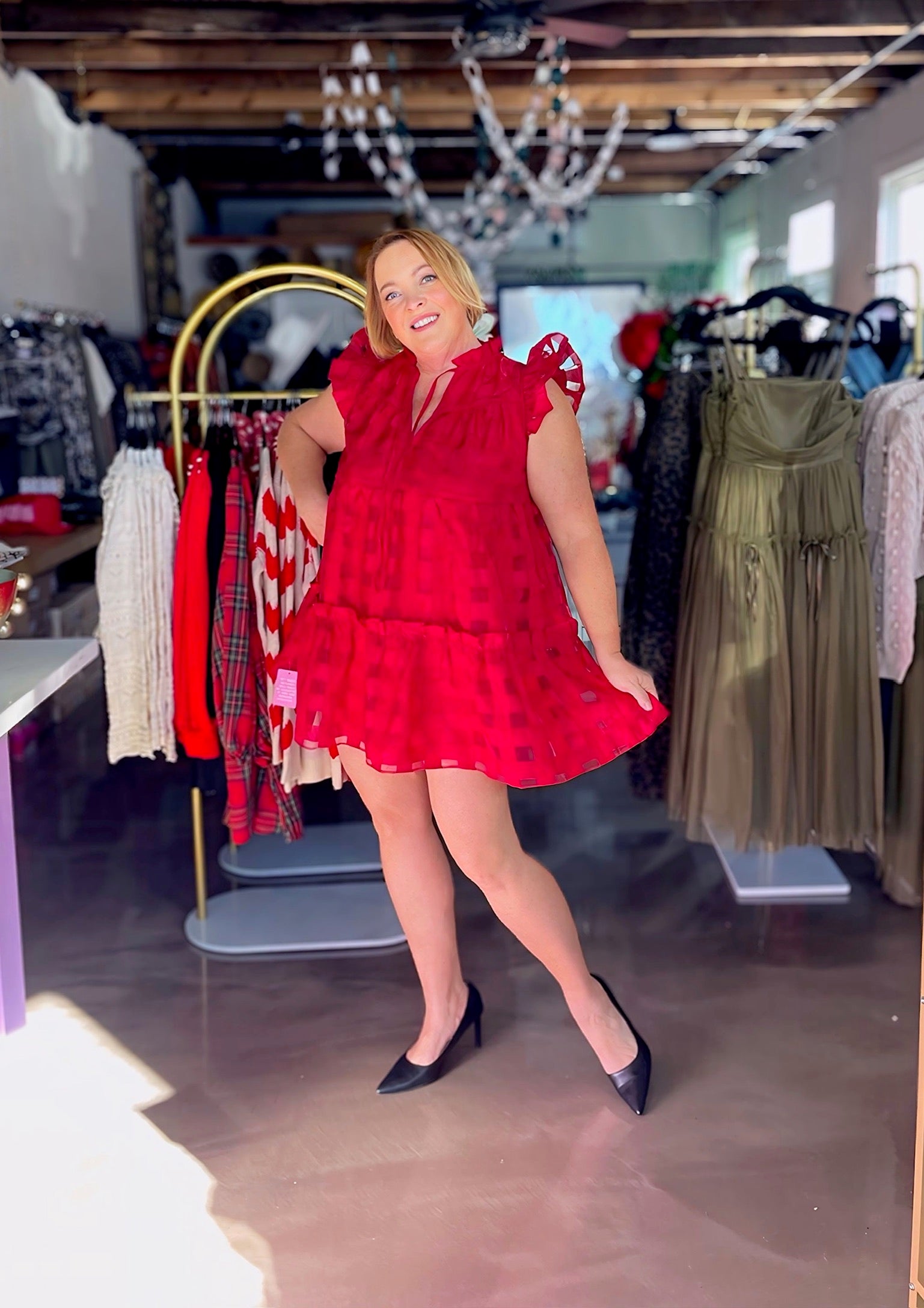 Elevate your style with our Mabel Ruby Checked Ruffle Dress. Featuring delicate frill sleeves and a subtle checker pattern, this stunning red dress is perfect for any occasion - from casual to formal. Dress it up or down, this versatile piece will add a touch of sophistication to your wardrobe.