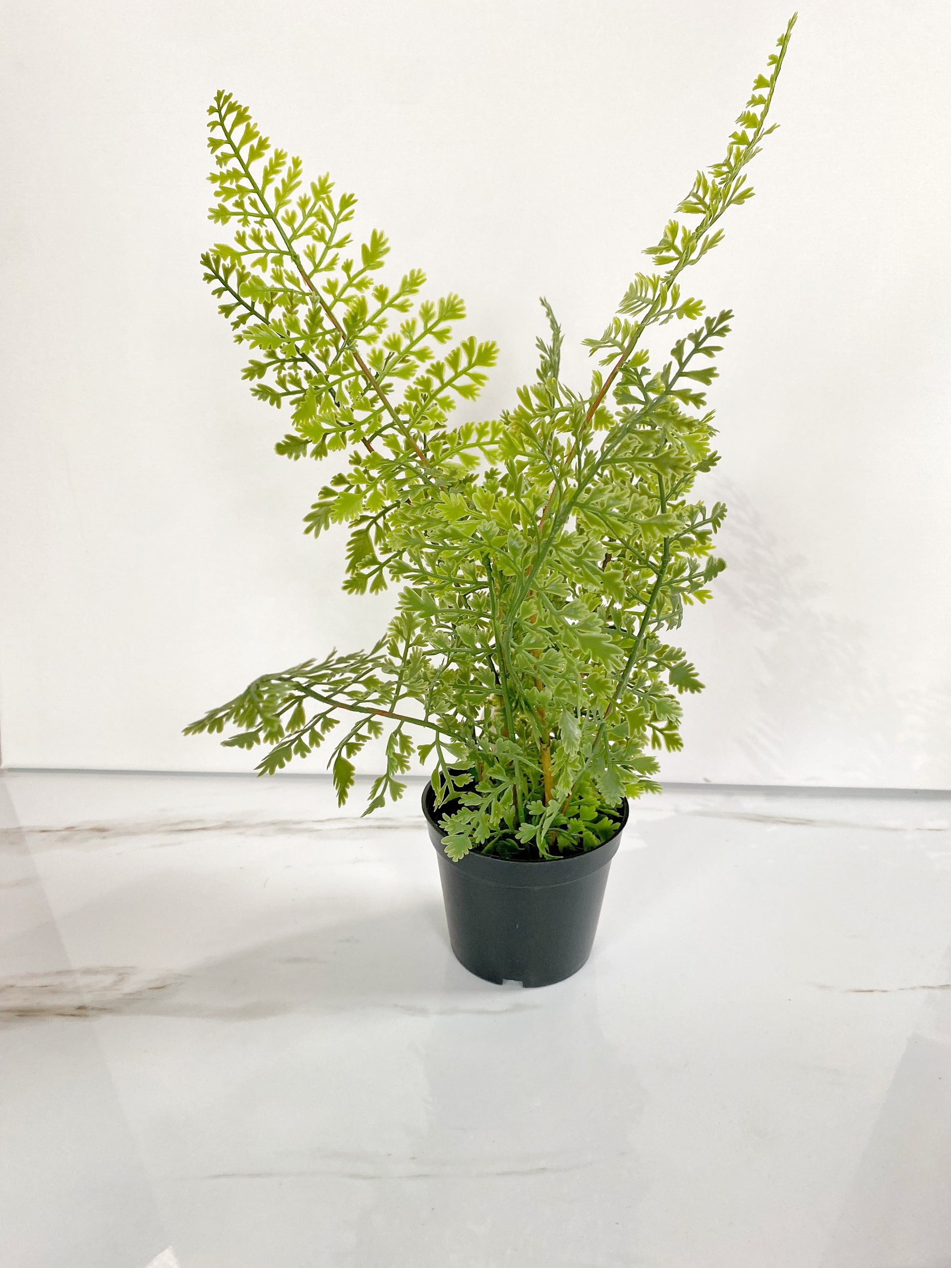 This mini potted fern brings a touch of nature to any space. The compact size, paired with the black plastic pot, makes it a perfect addition to any desk, shelf, or small area. Enjoy the beauty and benefits of plants without sacrificing valuable space.