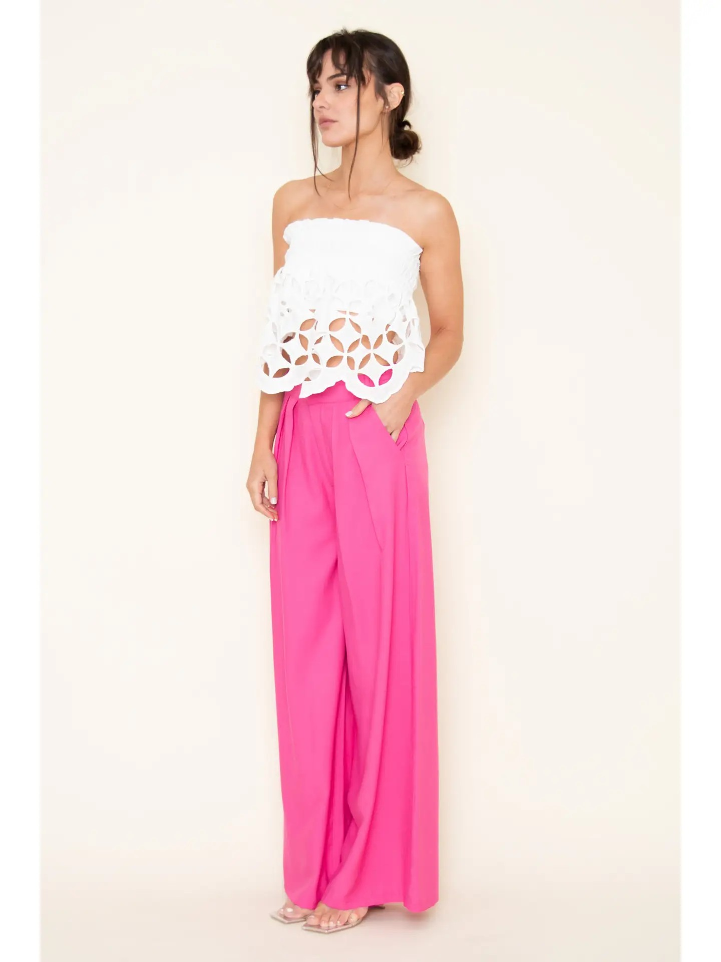 Add a touch of elegance to any outfit with the India Eyelet Top. This tube top features a smocked bandeau design and ruffle hem for a flattering and feminine look. The geometric and abstract embroidered eyelet sheer midsection adds a unique touch to this versatile piece. Perfect for any occasion, from a day out to a night on the town.
