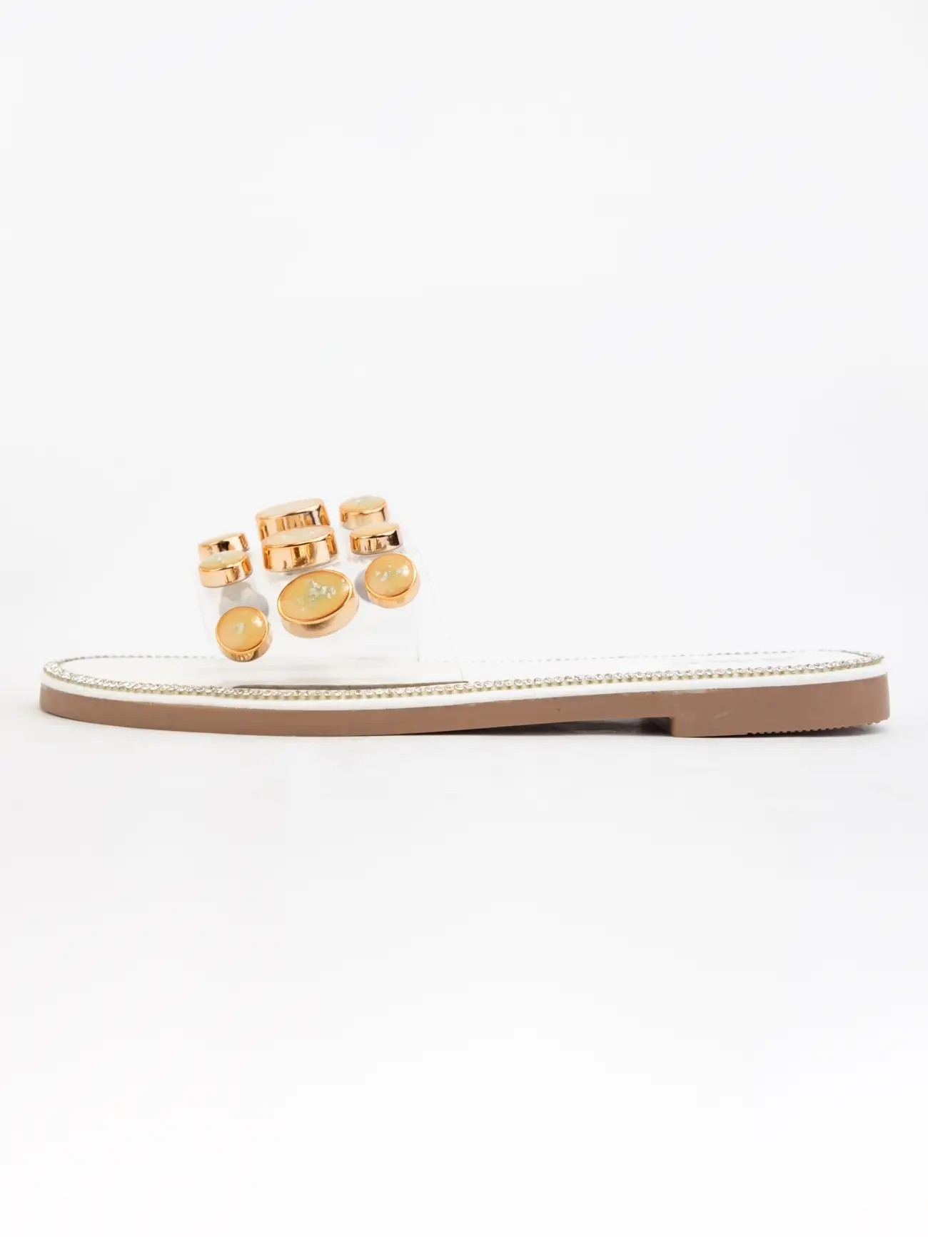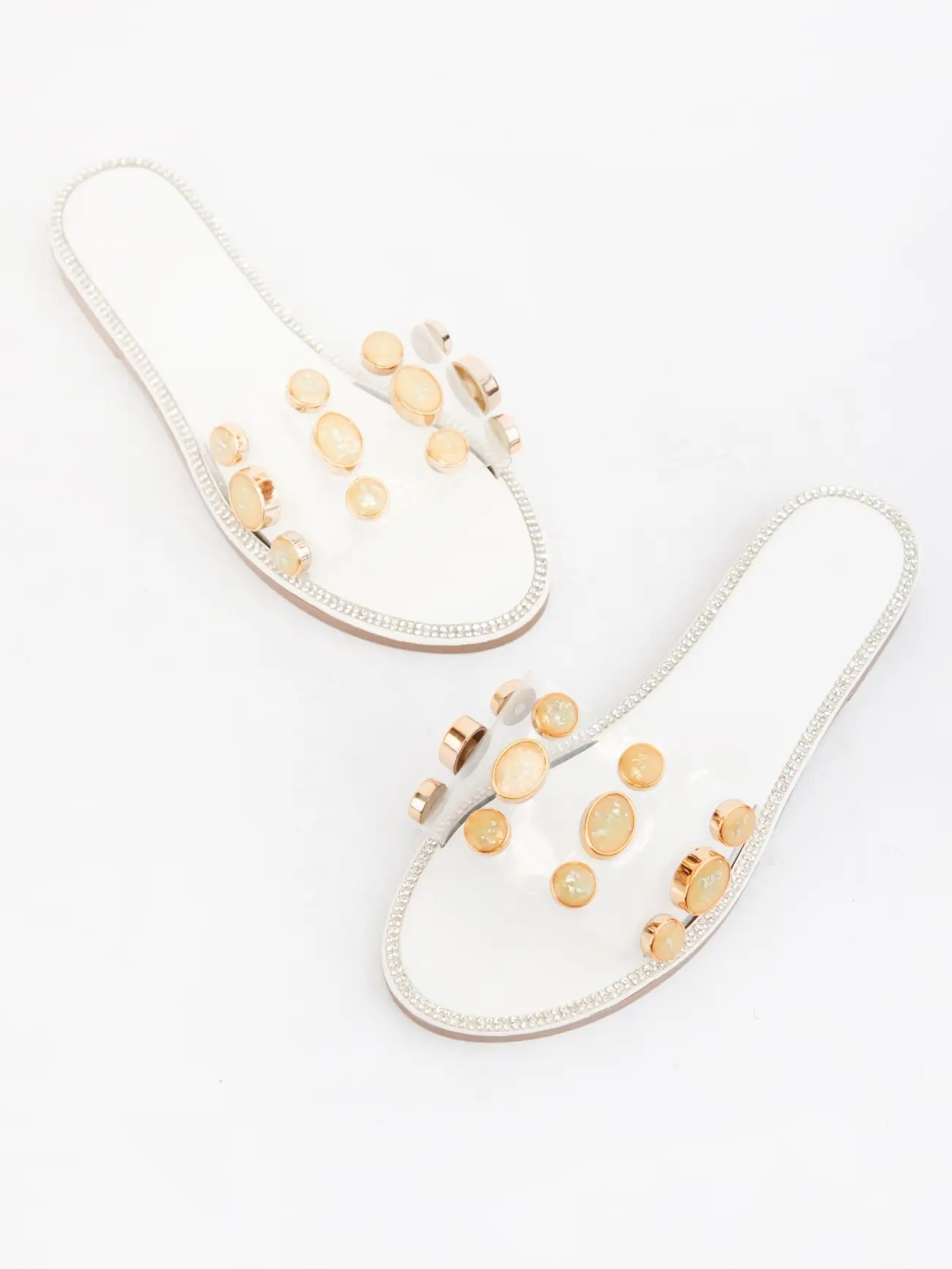 The Sunday Slide boasts a unique resin oval stud design on a clear PVC upper, adorned with sparkling rhinestones along the sole edge. Elevate your style with this eye-catching footwear, perfect for any occasion.